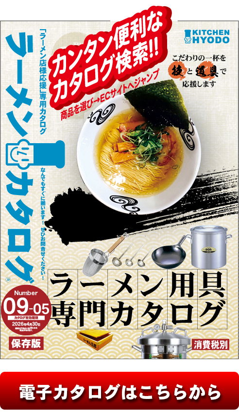 飲食店様応援!!冊子のラーメンカタログが電子版になりました!!ラーメン作りに必要な道具が何でも揃います!!その外にも、「うつわ」「厨房機器」「テイクアウト容器」「のぼり」「のれん」「提灯」なども取り扱ってます!!カタログ内の商品にリンクボタンがありますので、押すと商品ページへ移動できます!!